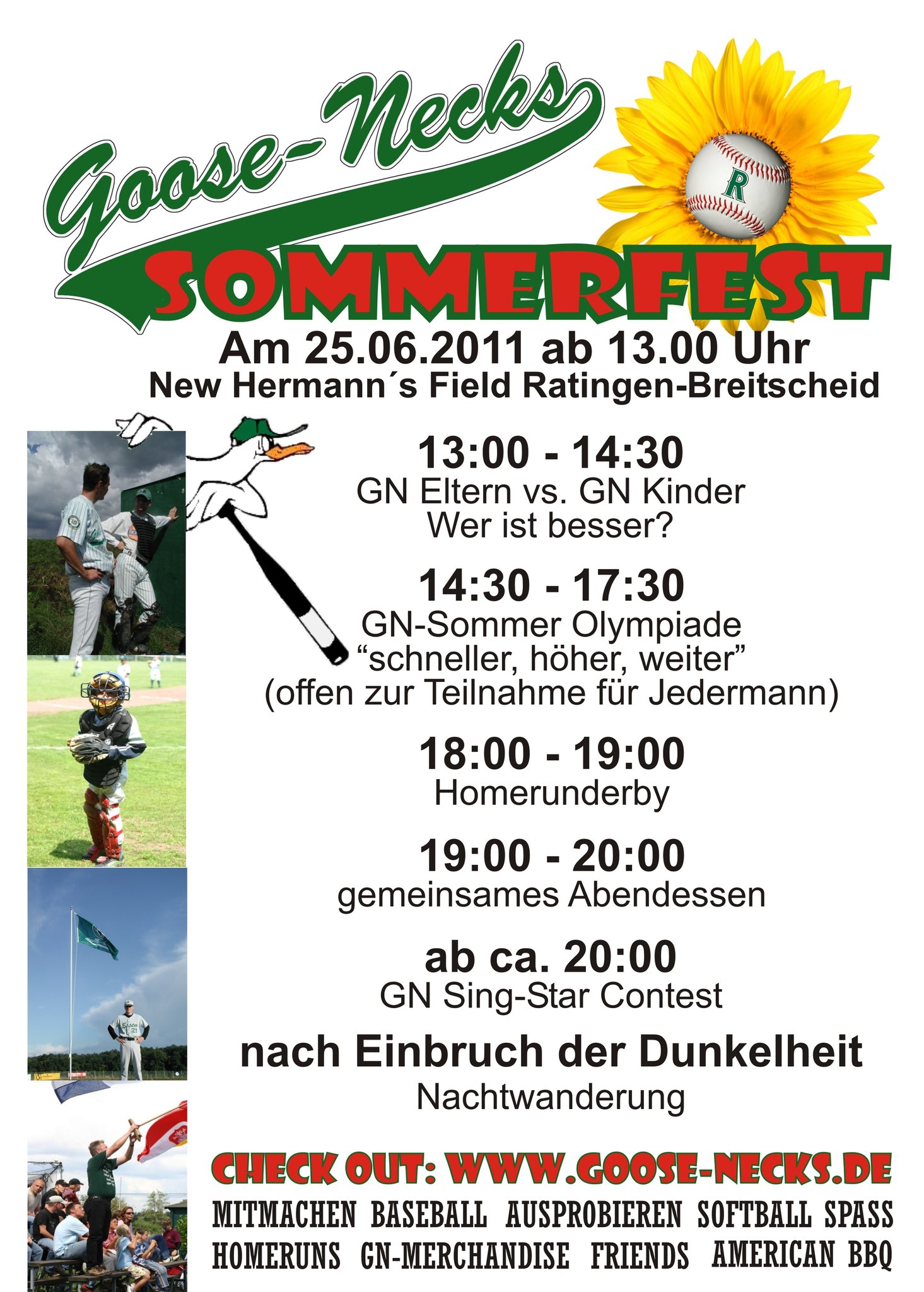 An diesem Wochenende findet wieder das alljährliche Sommerfest der Ratingen Goose-Necks auf dem New Herman's Field statt. Um den 13 Uhr beginnen die Spieler und Spielerinnen aus den Goose-Necks Jugendteams. Dabei werden sie an diesem Tag ihren Eltern auf dem Spielfeld gegenüber stehen. Wer kann dieses ungleiche Duell für sich entscheiden?